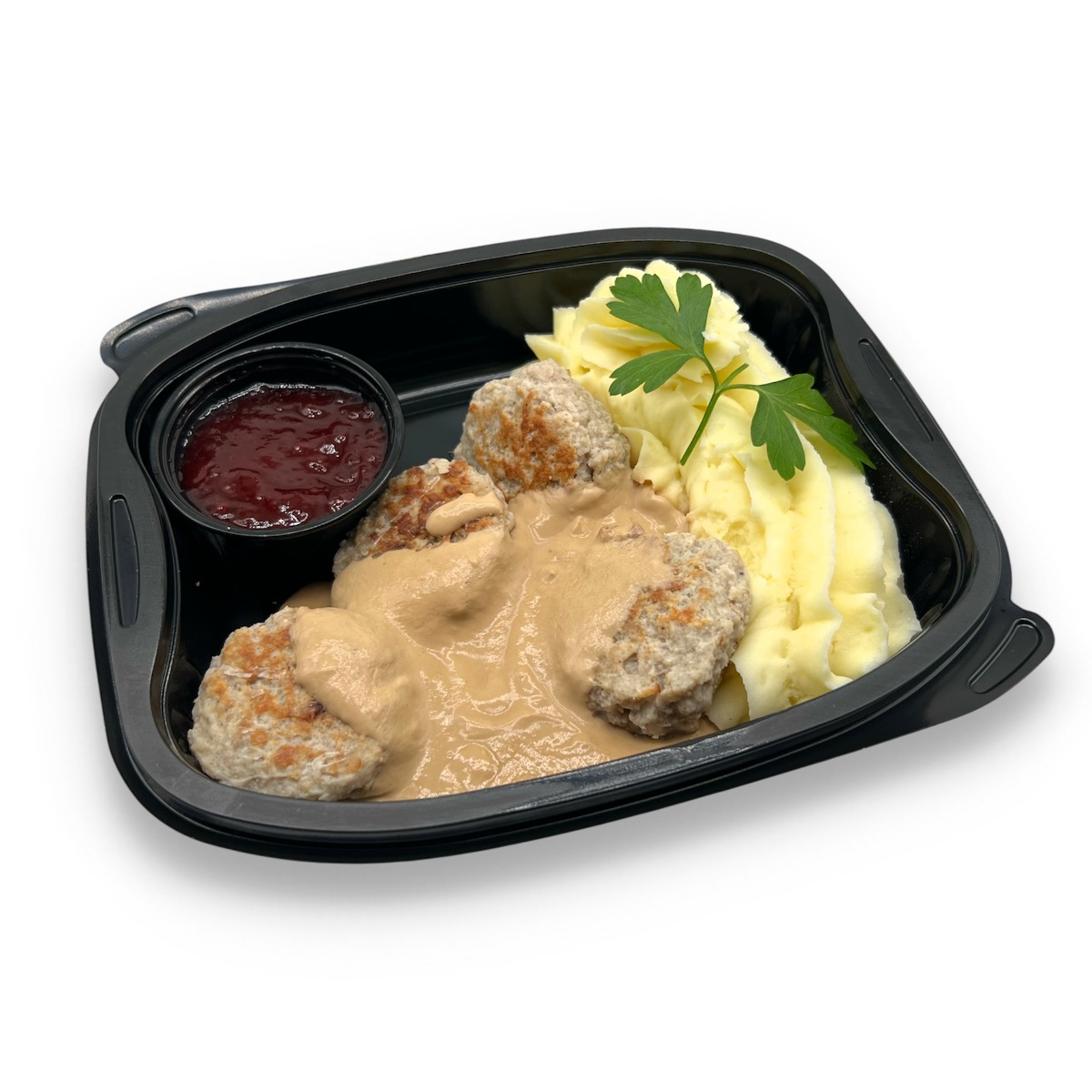 Stekta köttbullar med gräddsås (gjord på grädde!), riktigt potatismos och lingonsylt.