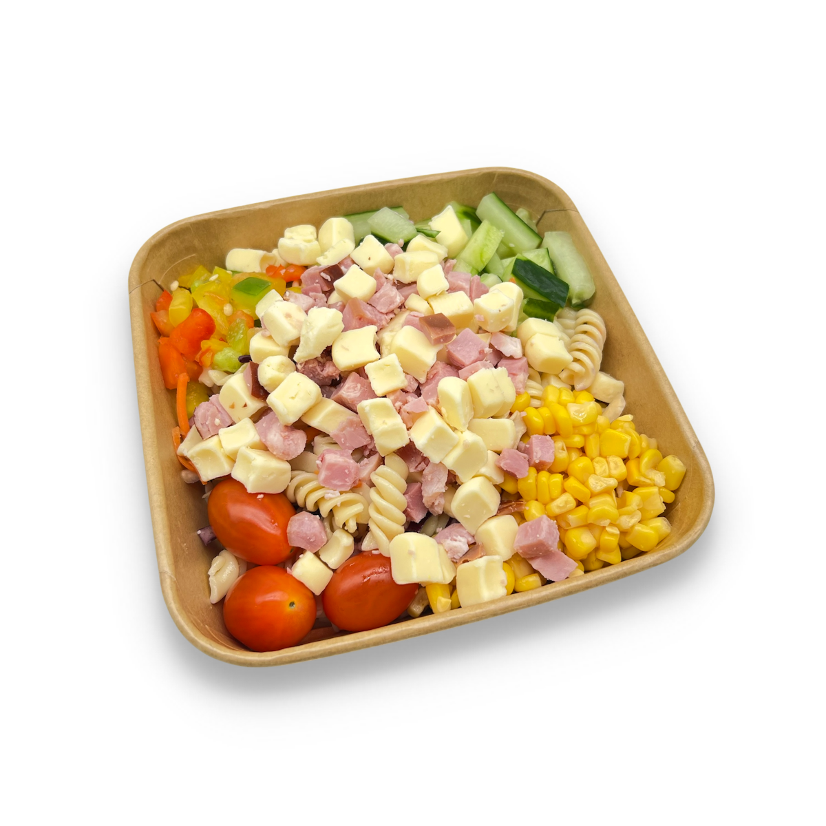Pastasallad med Ost, rökt skinka, pasta, cocktailtomat, gurka, paprika, majs, strimlad rödkål, vitkål, morotsjulienne. Vi erbjuder flera val av dressingar till din sallad som tex:. Vitlök, Vinägrett, Caesar, Mango/Curry, Rhode Island.