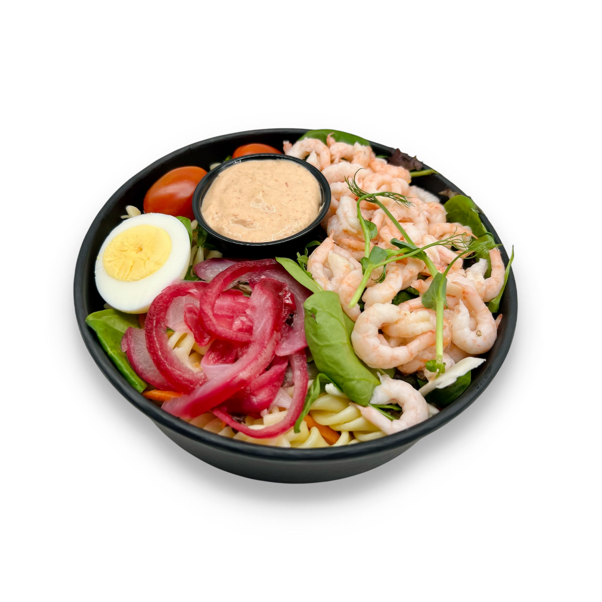 Handskalade räkor, ägg, pasta, sallad, tomat, picklad rödlök och Rhode islanddressing.